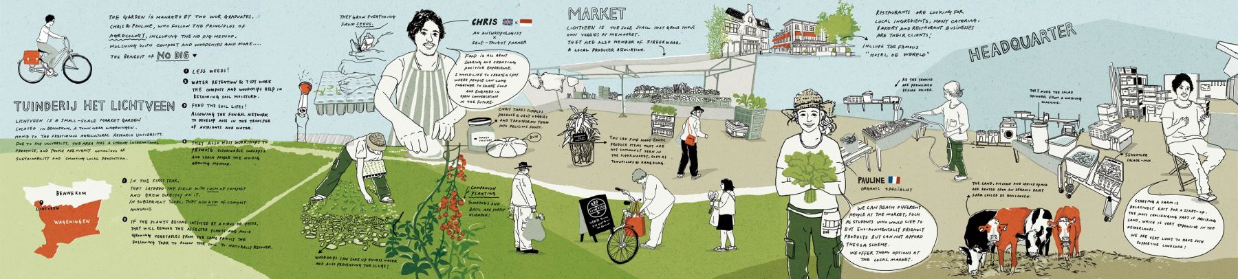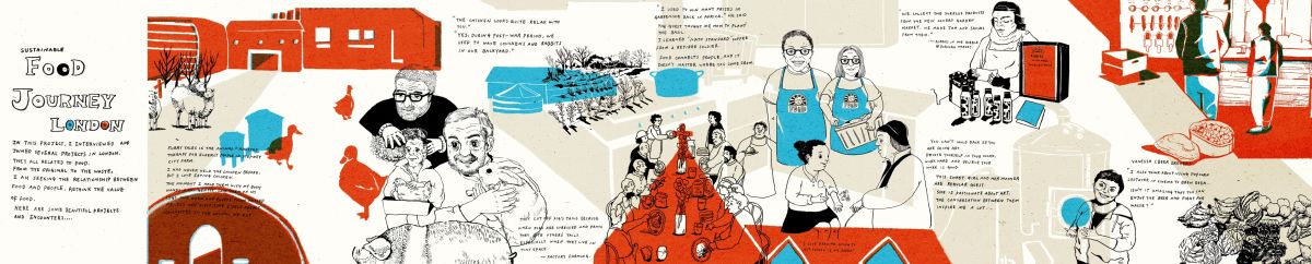 2018年於倫敦聚焦城市剩食、經濟動物與季節性作物議題。透過走訪城市中的菜園與農場、搜集故事與案例,發展一系列紀實插畫。從觀察臺灣風土節氣的日常作物、採集都市裡可食用的野草,到實踐野草廚房烹調,希望透過五感體驗結合插畫,提高人們對於周遭環境的感知與對問題的意識。