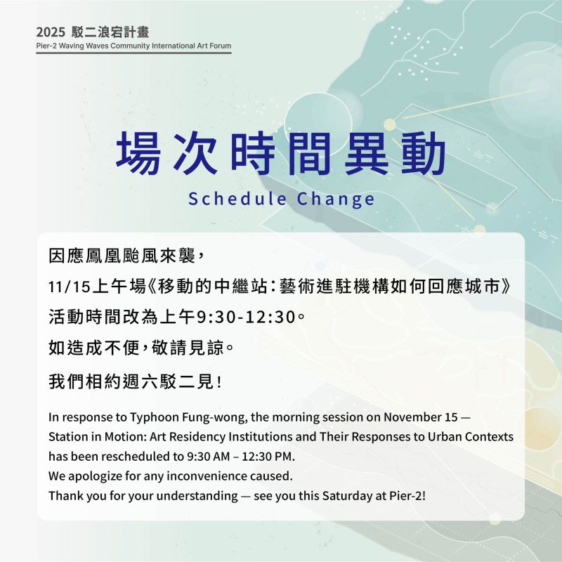 因應鳳凰颱風來襲,11/15上午場《移動的中繼站:藝術進駐機構如何回應城市》活動時間改為 上午9:30-12:30。